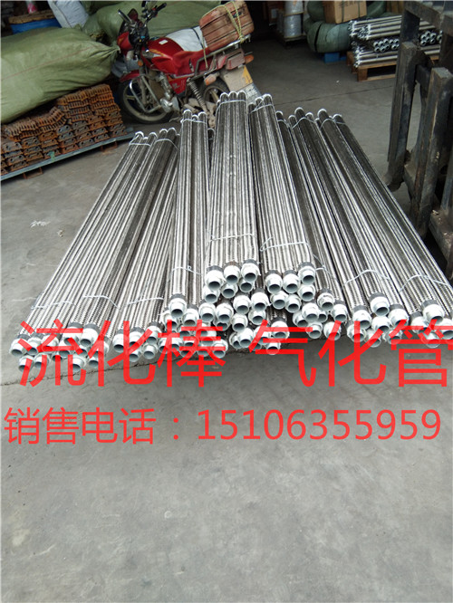 流化棒内管是选用热镀锌的钢管,首先由带钢三面冲孔,冲孔直径为6mm,以后采用高频焊焊接成管,在镀锌管外包裹两层专门定制一面绒面一面光面的300g/m2滤布,滤布外套有耐磨、耐腐蚀不锈钢波纹管,最后用400吨八口缩管机进行缩口,即保证了气化管良好的透气性,又避免物料进入气化管,延长了气化管使用寿命。库内安装均化装置,库内均化装置是我公司的专业设计,在出料及出库率的效果上能达到90%以上,我公司采用均化装置是我公司生产的流化棒,安装在库内填充斜面上,安装是按库内扇形排列安装,安装分为2环,减压锥内一环,减压锥外一环,每个扇形分为6个供气区域,6个区分为3个大区,供气为对称循环供气,安装间距大的是500mm,最小的是 300mm,安装的流化棒能在整个钢板库内达到每一个地方无死角,流化棒优点在于间距小,透气为4边透气,彻底达到均化效果,提高物料出库率。我公司提供的气化控制箱,为全自动电器操作系统,自动循环供气设计。